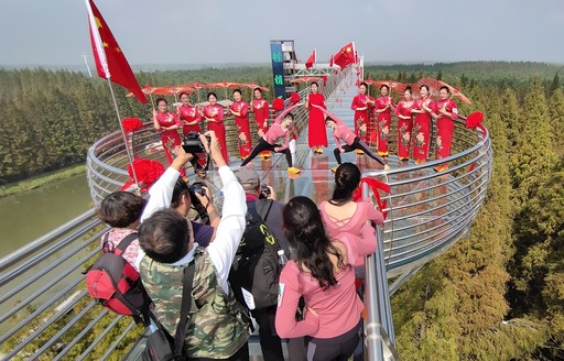 10月1日,江苏省金湖县邮政分公司工会与金湖电信分公司、金湖移动分公司工会一起,组织本单位部分女职工来到银涂镇万亩水森林,开展了“邮电女职工与国旗同框”主题活动。邮电女职工们身着旗袍登上高33.18米、长288.18米的“树梢王国”,与高高飘扬的国旗合影,庆祝新中国成立70周年。 □吉尔云 摄影报道