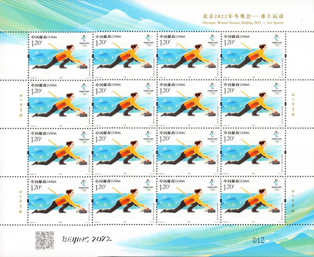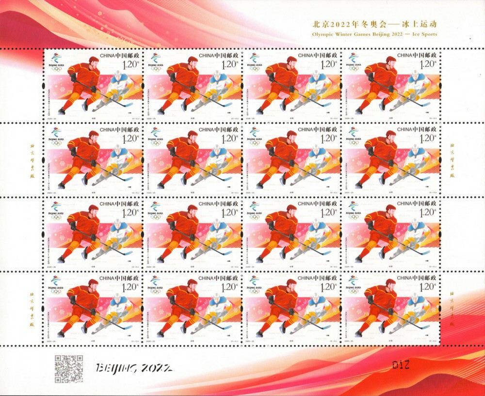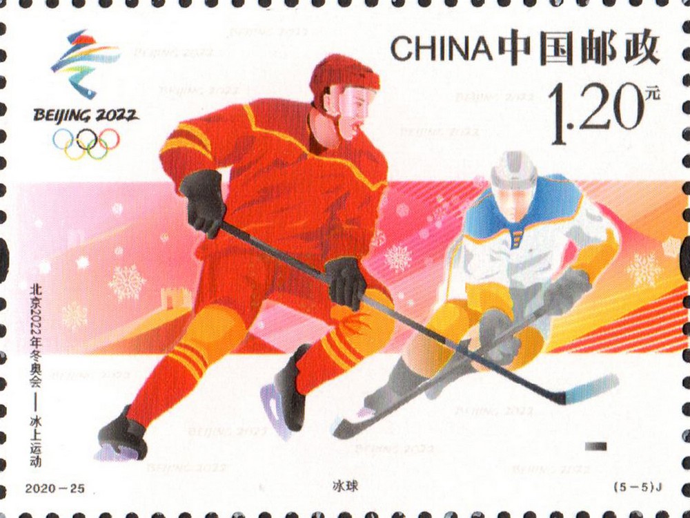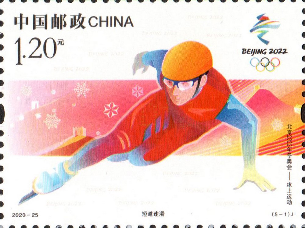 中国邮政定于2020年11月7日发行《北京2022年冬奥会——冰上运动》纪念邮票一套5枚。邮票图案名称分别为:短道速滑、花样滑冰、速度滑冰、冰壶、冰球。全套面值6元,计划发行量版式一870万套,版式二200万套(100万版)。