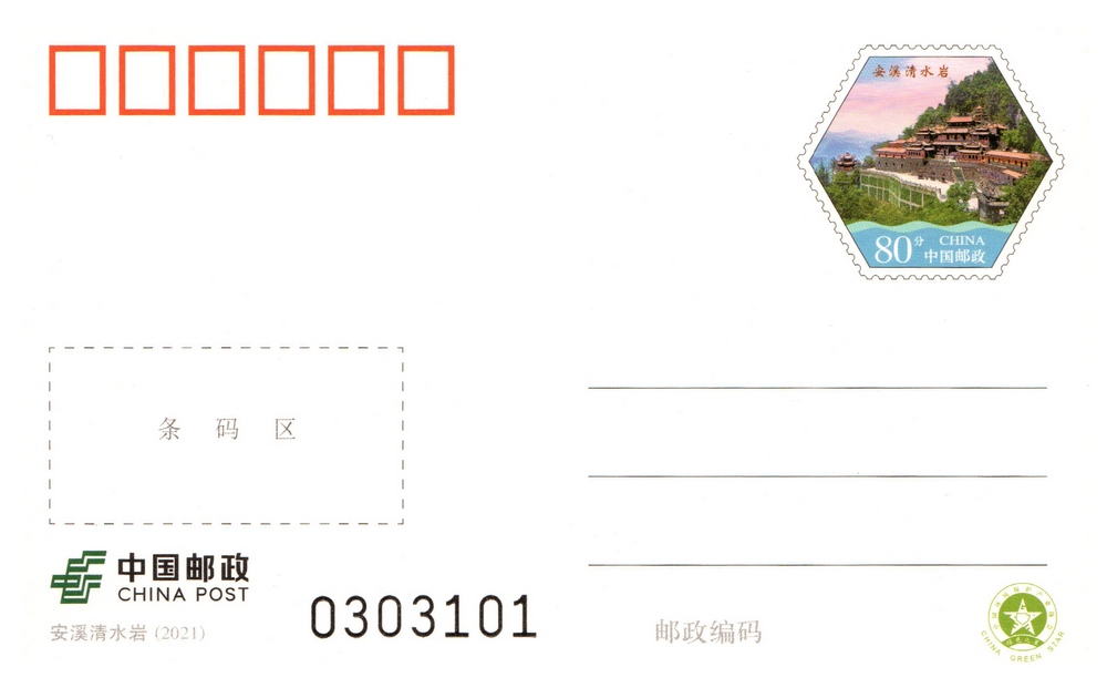 中国邮政定于2021年1月18日发行《安溪清水岩》普通邮资明信片1套1枚。详情如下: