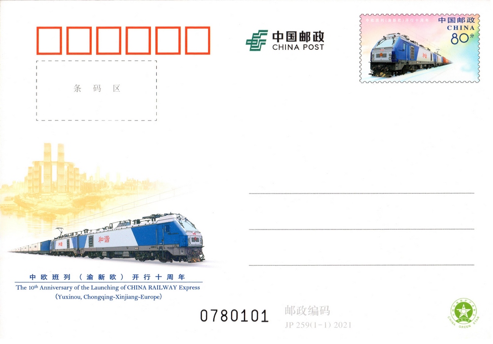 中国邮政定于2021 年3 月19 日发行《中欧班列(渝新欧)开行十周年》纪念邮资明信片1套1枚。详情如下: