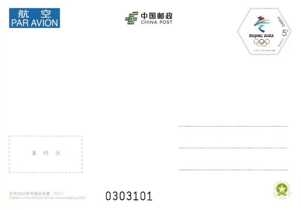 中国邮政定于2021年5月24日发行《北京2022年冬奥会会徽》普通邮资明信片2枚。详情如下: