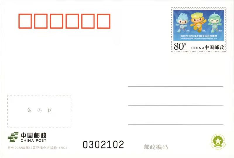 中国邮政定于2021年9月10日发行《杭州2022年第19届亚运会吉祥物》普通邮资明信片1套1枚。详情如下: